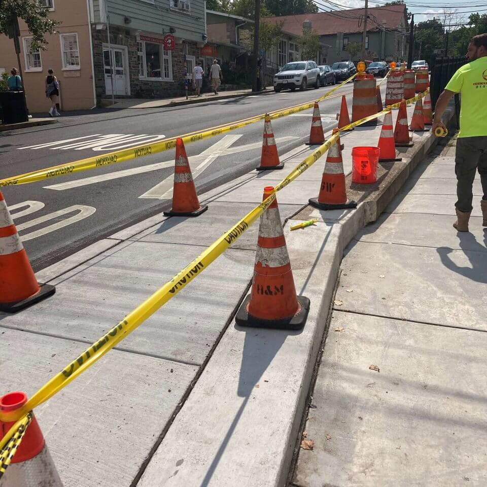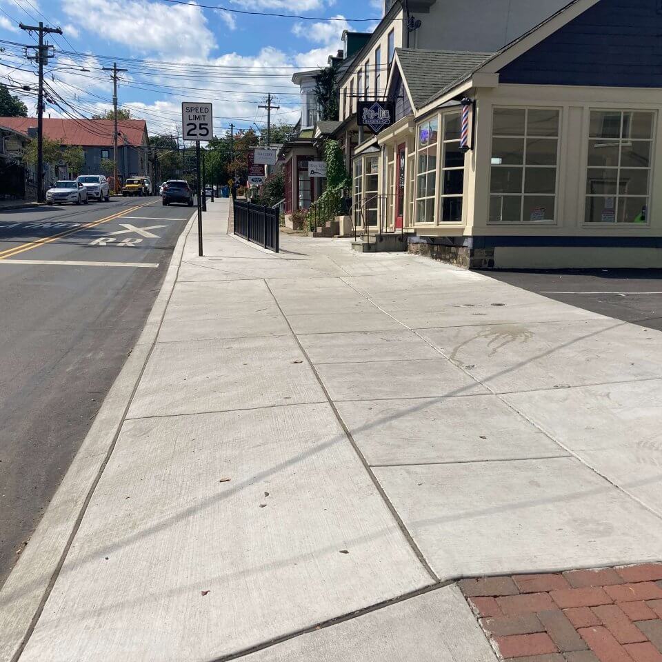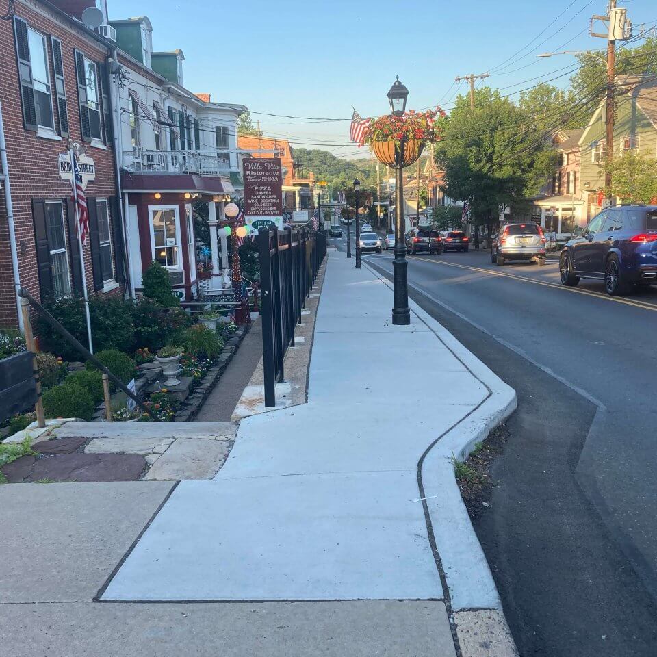 For this project. G&B Construction installed concrete sidewalk and curb along with a decorative guardrail on retaining walls along Bridge Street in New Hope, PA. Additionally, the G&B team installed a concrete driveway and white and yellow thermoplastic pavement marking.